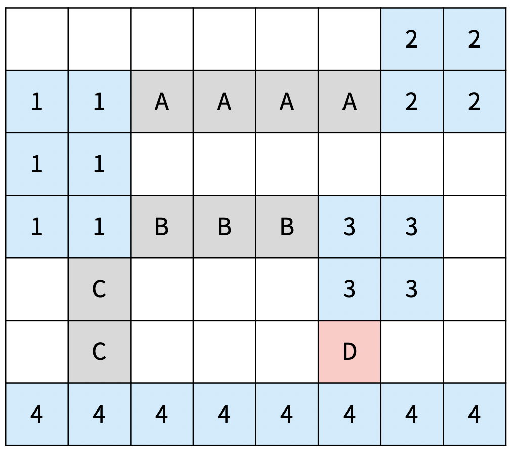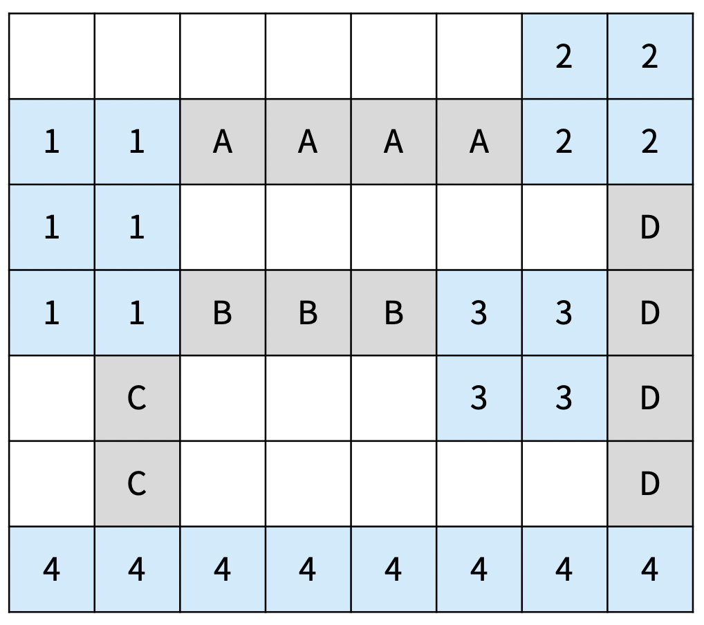 아래 그림은 섬을 모두 연결하는 올바른 2가지 방법이고, 다리는 회색으로 색칠되어 있다. 섬은 정수, 다리는 알파벳 대문자로 구분했다.