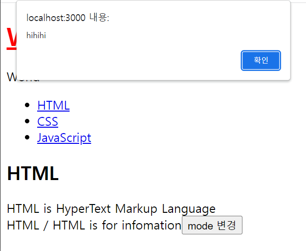 상단의 WEB 글자를 클릭하면, 상위 컴포넌트에서 선언한 onChangePage() 가 실행되어 alert이 출력되었다.