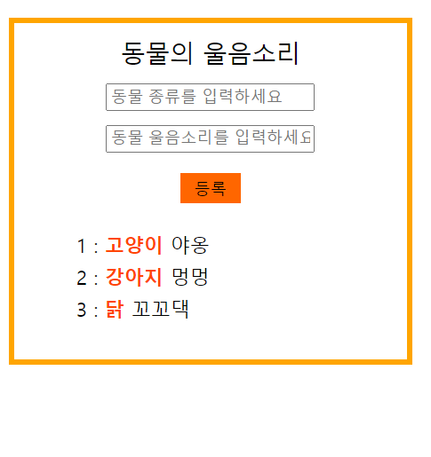 다음은 동물 종류와 동물 울음소리를 지정한 배열입니다.