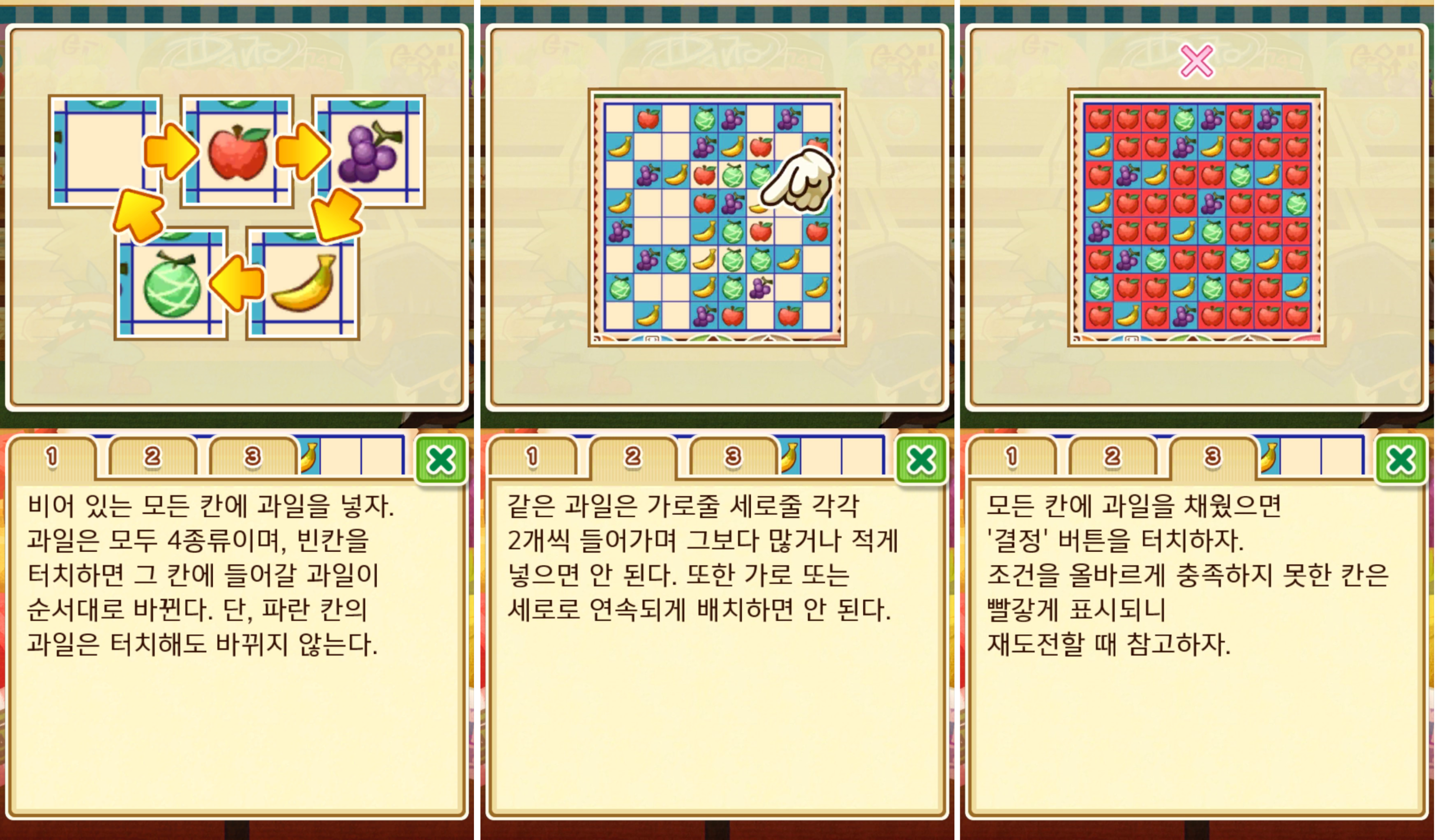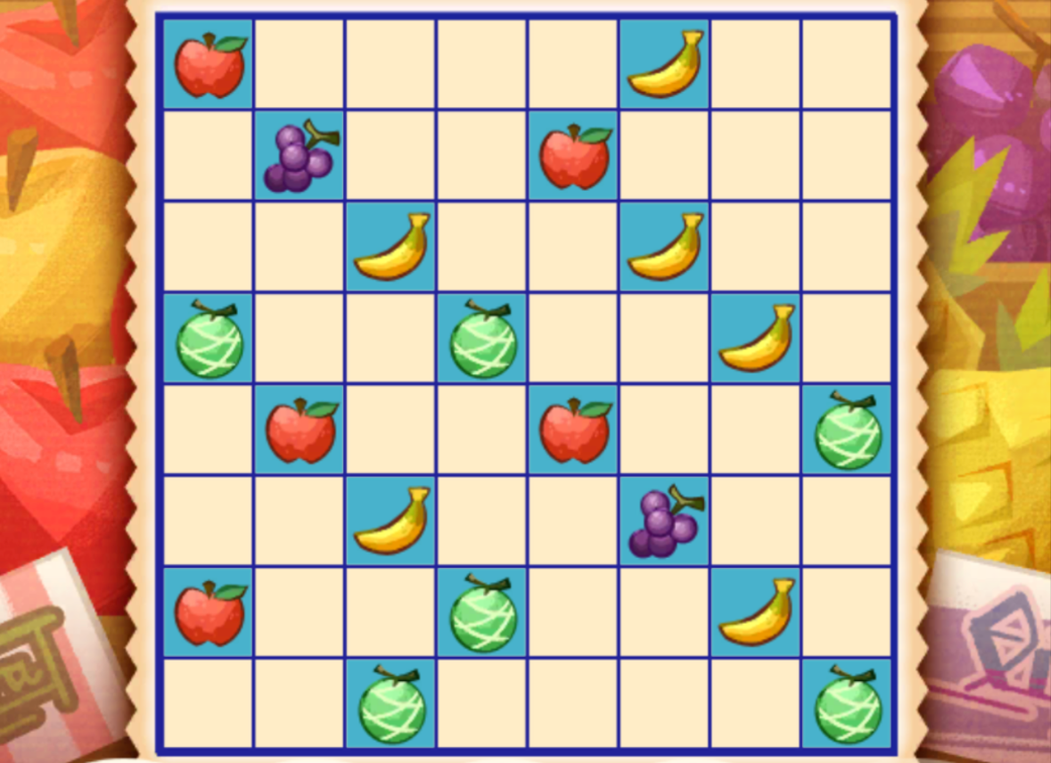 2. 8x8 타일 내에 가로줄, 세로줄에 과일의 종류가 각각 2개씩 들어간다.